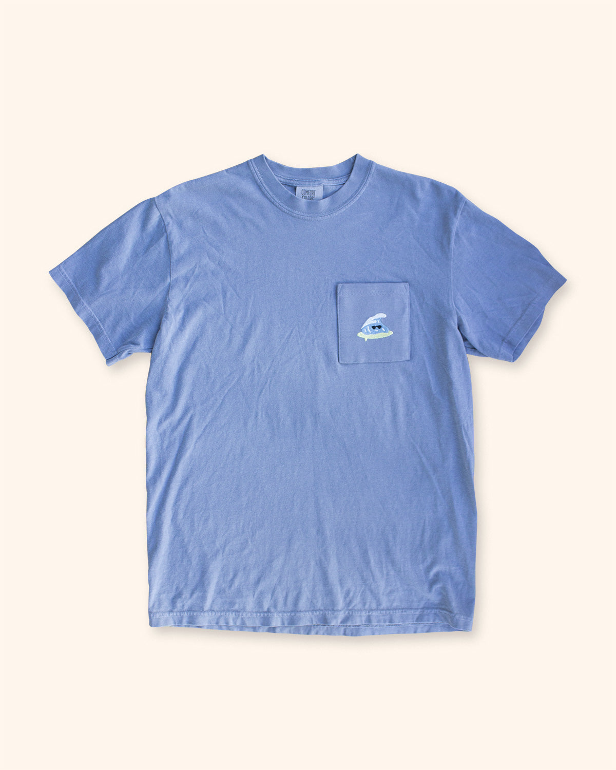 Original design embroidered on a 4" x 4.5" pocket. It's the coolest little wave dude on a surfboard. Color is washed denim.